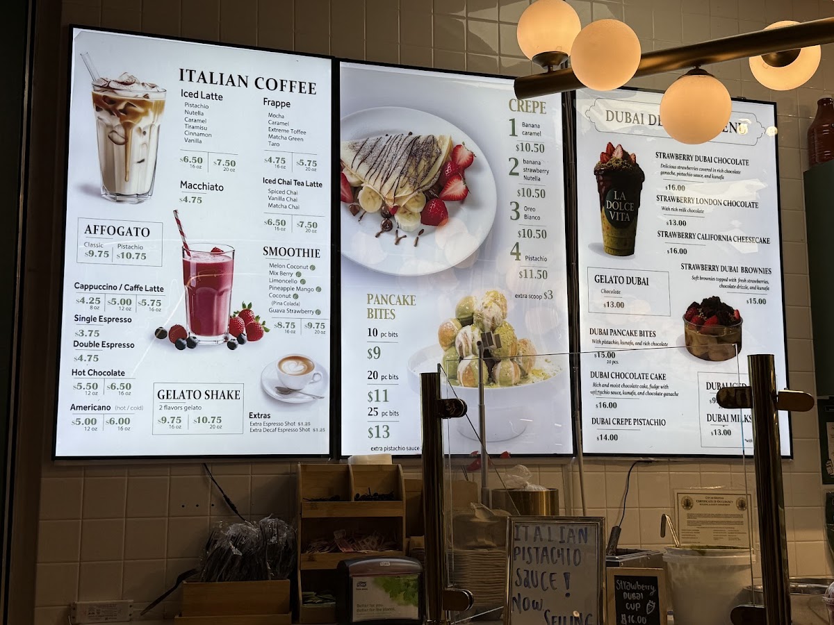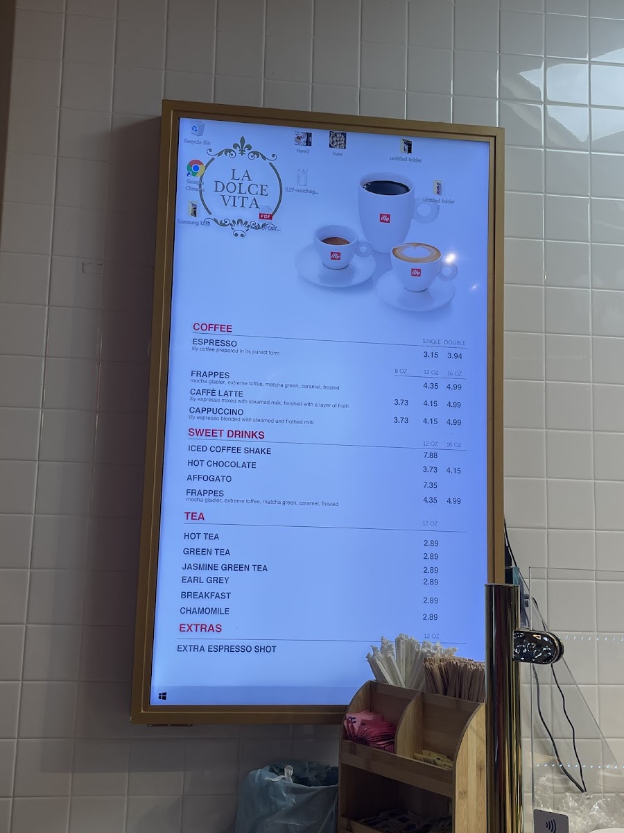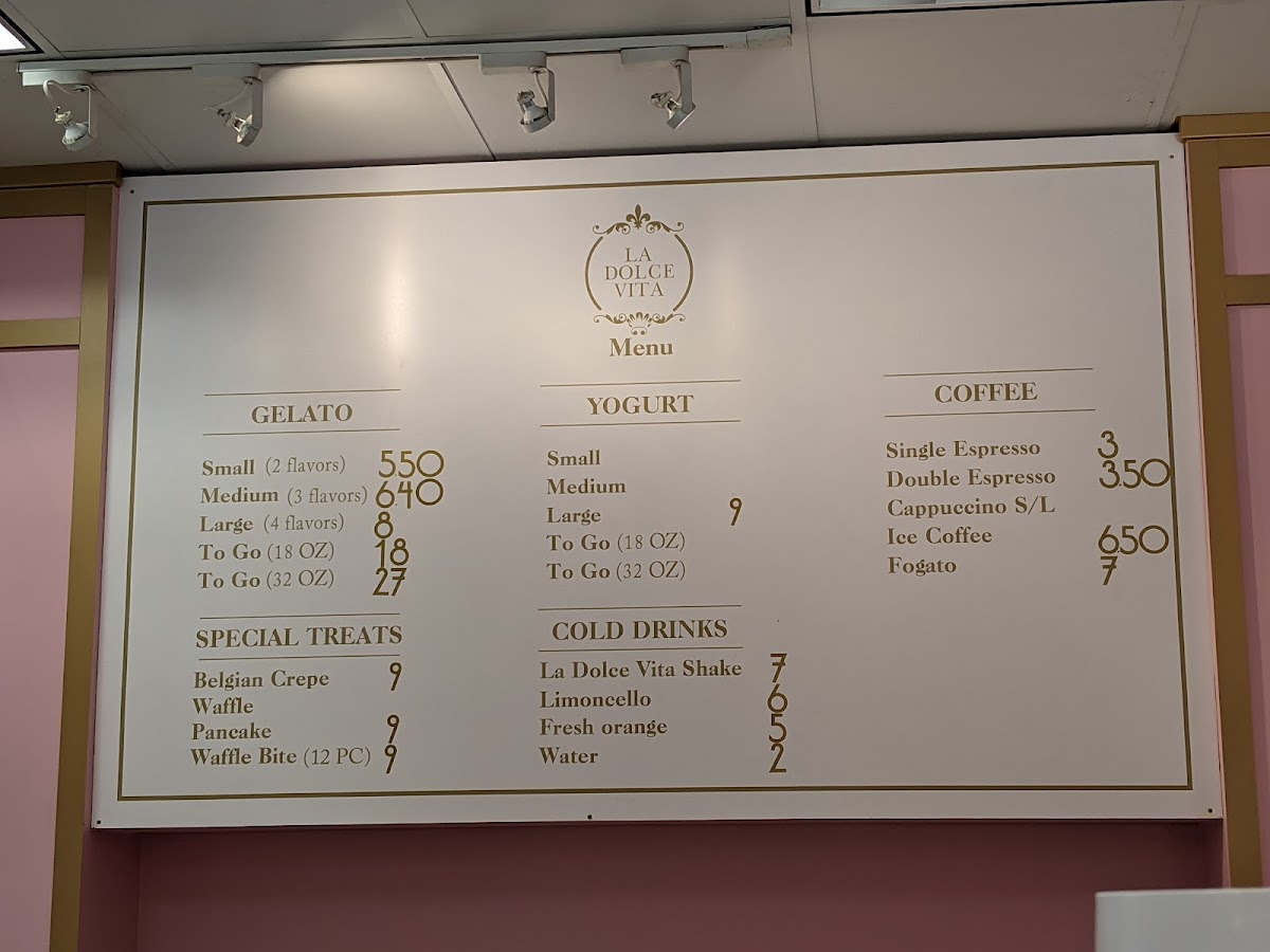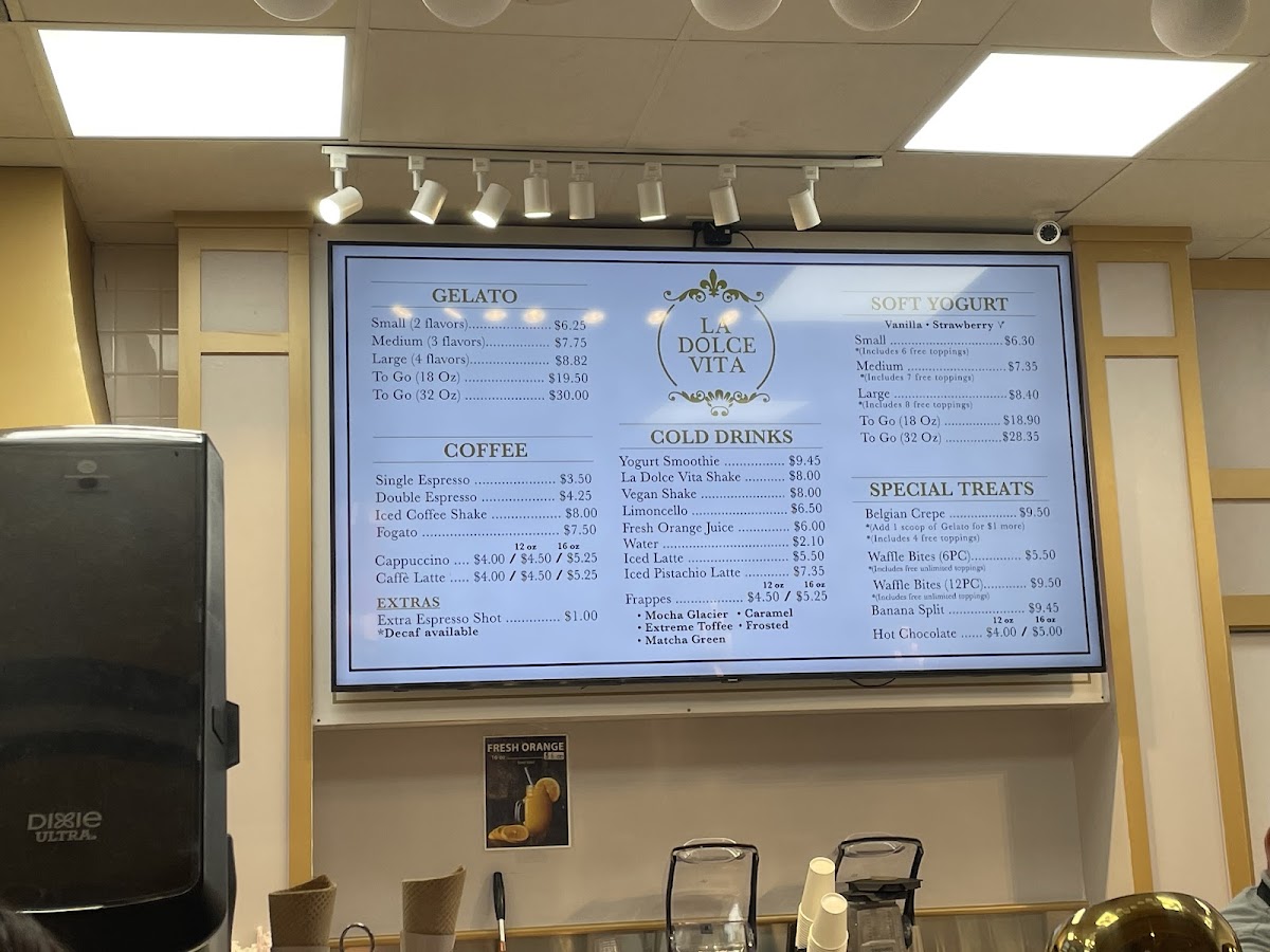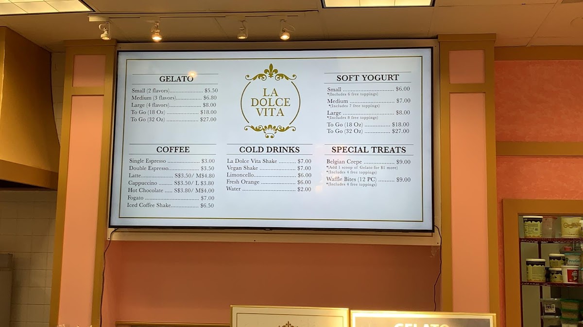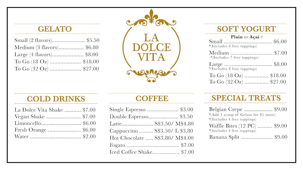 From a reviewer’s perspective, the menu at La Dolce Vita Gelato offers a delightful variety of sweet treats and refreshing drinks that cater to different tastes and occasions. The customizable Gelato (Small - 2 Flavors, Medium - 3 Flavors, Large - 4 Flavors) stands out as the highlight, along with convenient take-home options like To Go (18 oz) and To Go (32 oz). For those craving something more indulgent, the Belgian Crepe, Belgian Waffle, and upgraded options such as Belgian Waffle (with 1 scoop) and Belgian Waffle (with 2 scoops) provide a satisfying dessert experience, while Waffle Bites (6 PC) offer a fun, shareable treat. The drink selection is equally appealing, featuring refreshing options like Yogurt Smoothie, La Dolce Vita Shake, Vegan Shake, Limoncello, and Fresh Orange Juice. Additionally, the Soft Yogurt (Small, Medium, Large) with take-home sizes adds flexibility for yogurt lovers. Coffee enthusiasts can enjoy classics such as Single Espresso, Double Espresso, Cappuccino (12 oz), as well as unique picks like the Iced Coffee Shake and Fogato. Overall, the menu strikes a balance between variety and indulgence, making it an inviting spot for dessert lovers.